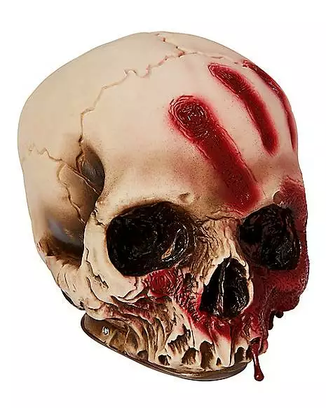 This skull features a bloody handprint on it and is the perfect decoration for any graveyard or skeleton display.