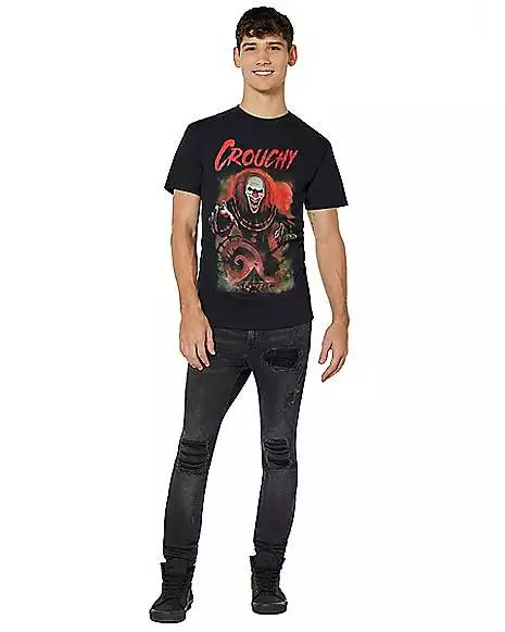 Celebrate your favorite scary clown animatronic with this Crouchy t shirt! This graphic tee features Crouchy’s blood-spattered teeth and scary smile in fear-inducing detail. Wear this Crouchy tee as its own costume or during the Halloween season to up the scare factor.