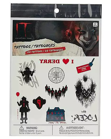 Easily show off your favorite horror movie with these official It: Chapter Two temporary tattoos! These tattoos include Pennywise the Clown, I heart Derry, Come Home and other phrases and images from this ultimate scary movie. Put these It Chapter Two tattoos on your face or arms to amp up your scary costume (sold separately).
